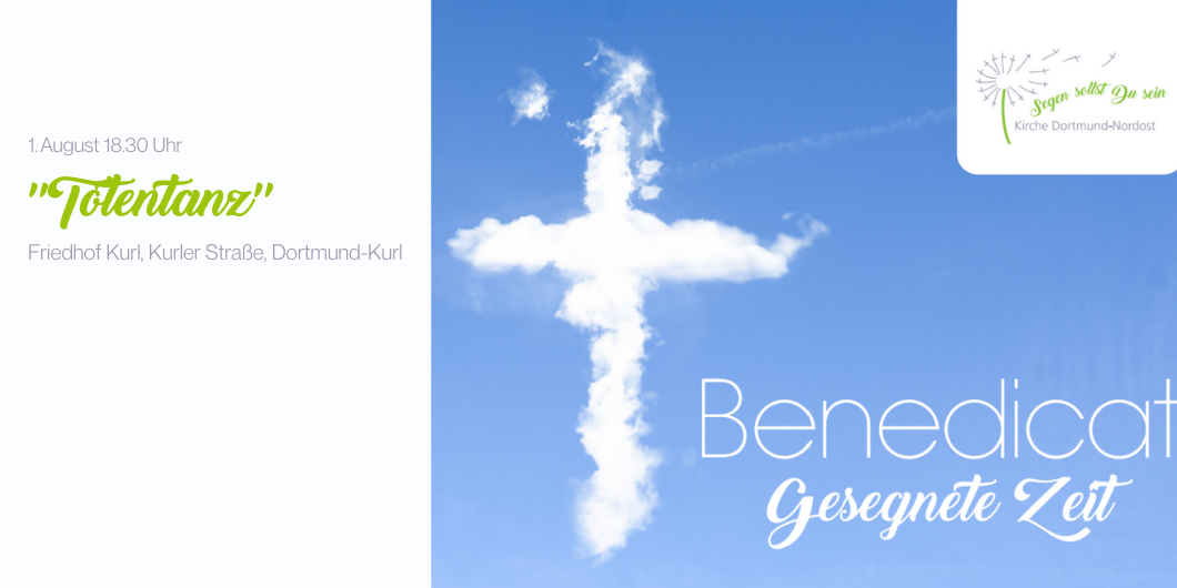 Herzliche Einladung zu unserem nächsten Benedicat-Gottesdienst am 1. August um 18.30 Uhr. Unter dem Motto „Totentanz“ feiern wir ihn auf dem Kurler Friedhof, Kurler Straße. Der Titel erinnert zunächst an die mittelalterlichen Bilder vom Tanz des Todes mit den Lebenden. Beim diesem Thema wollen wir aber eher an unsere christliche Hoffnung erinnern und daran danken, dass der Friedhof nicht nur ein Ort der Trauer und der Toten ist, sondern auch ein Ort des Friedens und der Lebenden. Diesen Gedanken wollen wir bei unserem Gottesdienst nachspüren und unserer Hoffnung auch durch „Tanz“ Ausdruck verleihen.