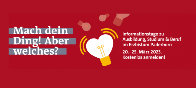 Berufsinformationstage 20. bis 25. März 2023 Komm vorbei oder logg dich ein! Infos und kostenlose Anmeldung: erzbistum-paderborn.de/dsdh Gute Gespräche führen, Infos holen, neue Möglichkeiten entdecken. Denn Kirche kann mehr. Genau…