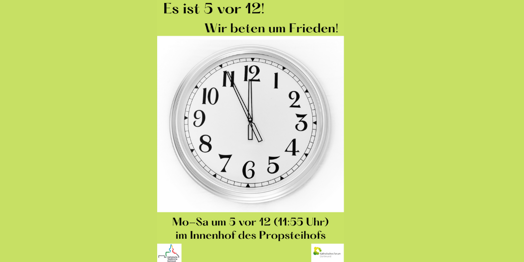 Feb.262022Aus Dekanat und BistumMontag bis Samstag um 11.55 Uhr im Innenhof der Propsteikirche. KommentarnavigationZurückVorheriger Beitrag:Aktion in der Johannes-Baptista-Gemeinde: „Was macht DAS mit mir?NächstesNächster Beitrag:Gehet hin in Frieden