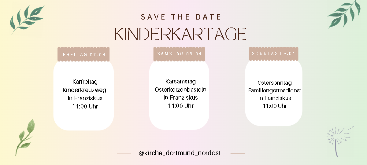 Apr.32023AktuellesAn Karfreitag, Karsamstag und Ostersonntag werden die Kinderkartage angeboten. Details siehe Beitragsbild KommentarnavigationZurückVorheriger Beitrag:Von Palmsonntag nach OsternNächstesNächster Beitrag:„Back to the roots – Zurück zu den Wurzeln!“