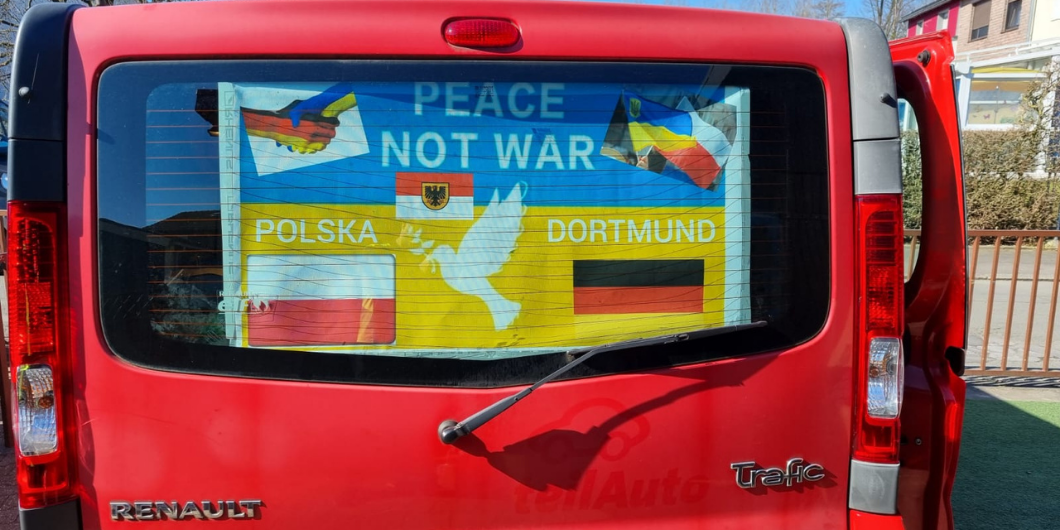 Eine private Initiative hat medizinisches Material gesammelt und bringt es direkt an die ukrainische Grenze, auf dem Rückweg werden 6 Personen mitgenommen, die in Scharnhorst bereits Kontakte haben. Das Foto zeigt den vollgeladenen Bulli der Franziskus-Gemeinde kurz vor dem Start mit einer unübersehbaren Botschaft im Heckfenster für die anderen Verkehrsteilnehmer. Ermutigende Zeichen in einer entmutigenden Weltlage!